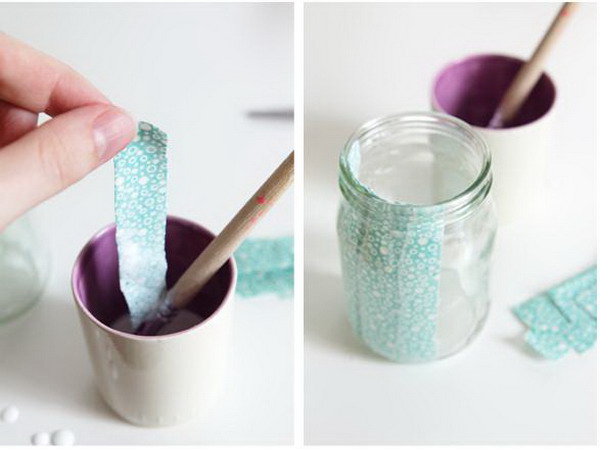 Com o pote de vidro sem rótulo e uma tesoura, recortamos o pedaço de tecido que você desejar e deixamos um dedo de folga no tamanho. Colocamos 1 parte de cola em um recipiente e 2 partes de água, misturamos bem e aplicamos no vidro por dentro e por fora, mas em tiras (por dentro podemos colocar outro tipo de tecido, feltro etc, ou também podemos não colocar nada) esperamos secar e pronto, é só você colocar a vela (se escolher colocar a vela, não coloque o tecido) ou colocar lápis e fazer disso um porta lápis.